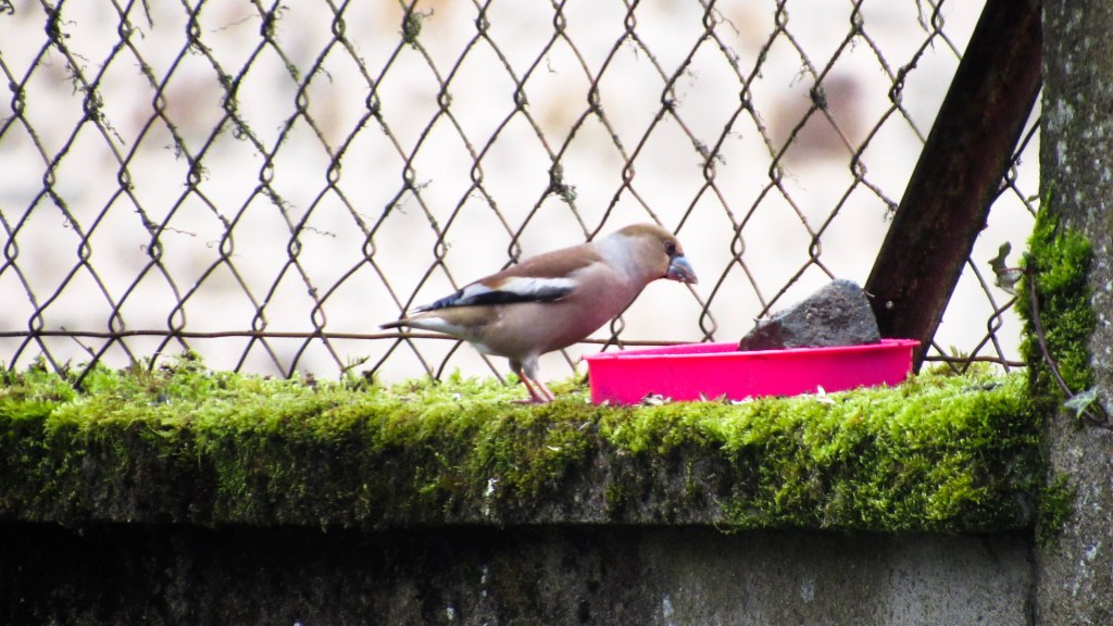 Nous avons pu remarquer, très récemment, la visite du Gros bec (mâle et femelle) sur le rebord du mur mitoyen au plus haut point pour le mâle et le point situé en contre bas pour la femelle (mangeoire recyclée en plastique).