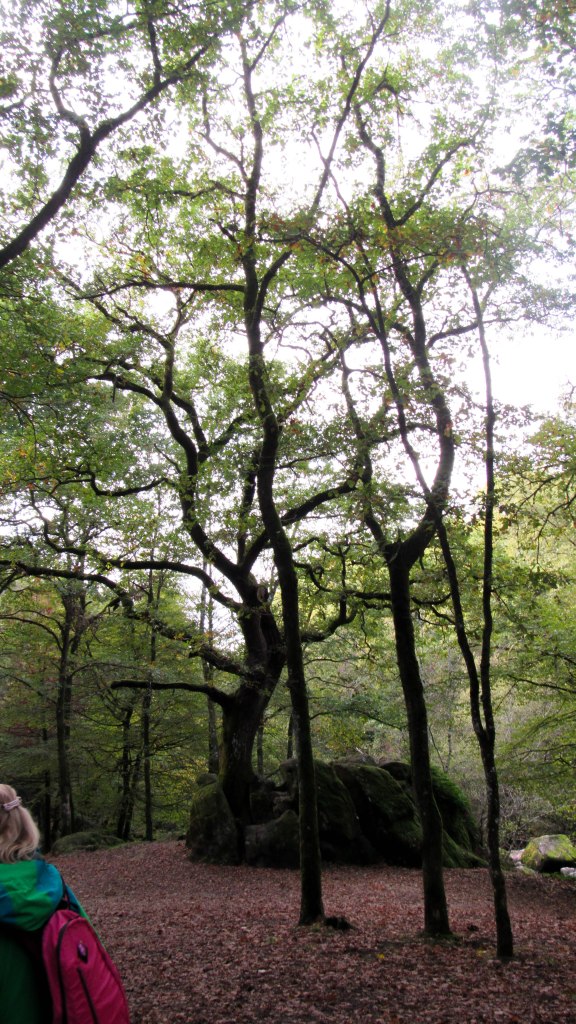 Nous quittons le lieu temple pour un circuit zigzagant. Nous marchons entourés d’arbres, autochtones, endogènes, indigènes, ancienne châtaigneraie, chemin filet qui ne cesse de monter, de créer de l’instabilité sous nos pieds.