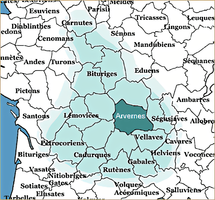 Leur influence dépassait largement les frontières géographiques de l’Auvergne actuelle et nombre de peuples voisins étaient clients des Arvernes : les Cadurques, les Gabales, les Vellaves, les Heleuteri, les Ségusiaves, les Ruthènes et les Helvii. Tous ces peuples ainsi que leurs voisins et alliés, les Lémovices, Pétrocores, Bituriges et peut-être les Carnutes, constituaient la Confédération Arverne. Source