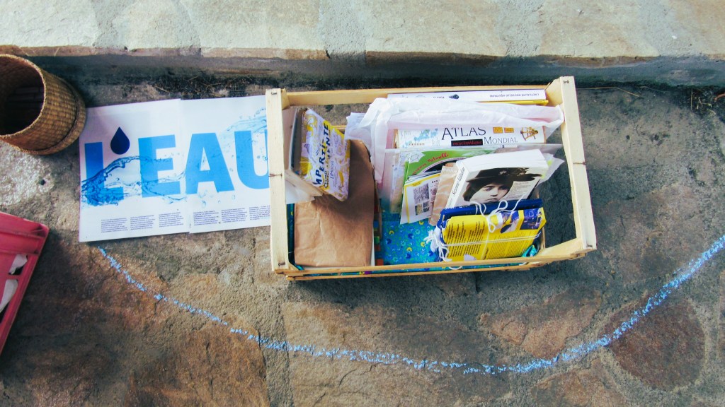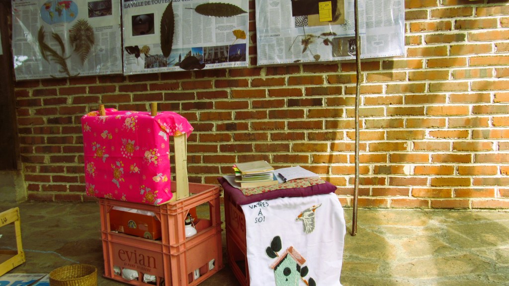 Nous avons ajouté notre rapport au déchet, avec le recyclage, la seconde main, notamment pour les livres et le Label Emmaüs, partenaire naturel de ce projet parce que fournisseur officiel, la broderie « Vayres à Soi » fait main d’une artiste brodeuse de Poitiers (Manon Pouille), des coussins, du confort de visite, des coups de craies de trottoirs un peu partout, autour et dans le lavoir, rien que pour écrire sur l’eau… Et puis, du linge, parce que le vêtement est un grand consommateur d’eau, l‘industrie textile est un des pire désastre écologique à ce sujet.
