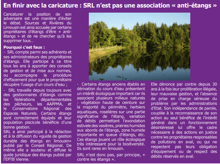 « Dans les bassins où il n’y pas, ou très peu, d’étangs, l’eau est présente tout le temps dans les rivières, y compris l’été et en période de sécheresse. Or, dans le Limousin, le trop grand nombre d’étangs pose problème et pourrait être responsable d’une véritable pénurie d’eau à long terme. »Les étangs accentuent la sécheresse selon l’association sources et rivières-en-limousin