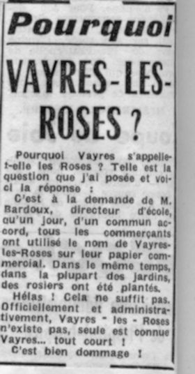 Dès le XX ème siècle, vers les années 30, puis en 1957 – » Extrait presse » – Pourquoi Vayres s’appelle-t-elle les roses ? Telle est la question que j’ai posé et voici la réponse: C’est à la demande de M.Bardoux, directeur de l’école, qu’un jour, d’un commun accord, tous les commerçants ont utilisé le nom de Vayres -les-Roses sur leur papier commercial…Source