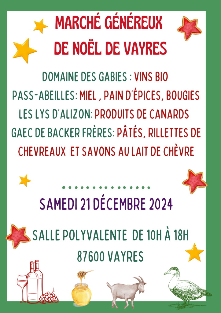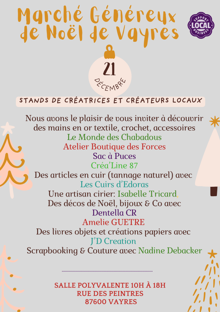 Votre Marché Généreux de Noël aura lieu à Vayres, le samedi 21 décembre 2024 de 10h à 18h dans la jolie salle polyvalente toute décorée, étoilée et dorée pour l’occasion!