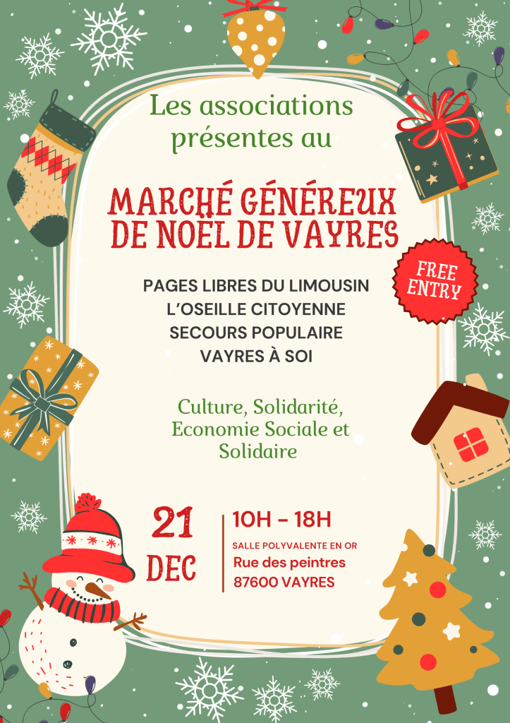 Vayres à Soi pour présenter la petite ressourcerie verte (lutte contre le gaspillage florale) La Vayres à boire (collectif théâtre amateur engagé), un petit stand emploi, assurer un atelier écrire à Mère Noëlle …