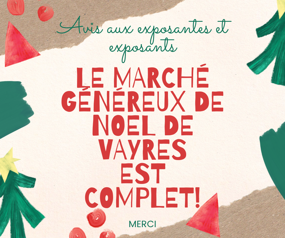 Merci aux exposantes et exposants de vous renseigner sur l’organisation de ce marché. Nous sommes l’association Vayres à Soi. Nous avons lancé, tout début septembre, un appel à participation qui s’est terminé le 21 novembre. Nous avons ensuite, choisi les 25 exposantes et exposants de la salle polyvalente (seul espace où il se déroule) et annoncé au plus tard le 26 novembre notre sélection.
