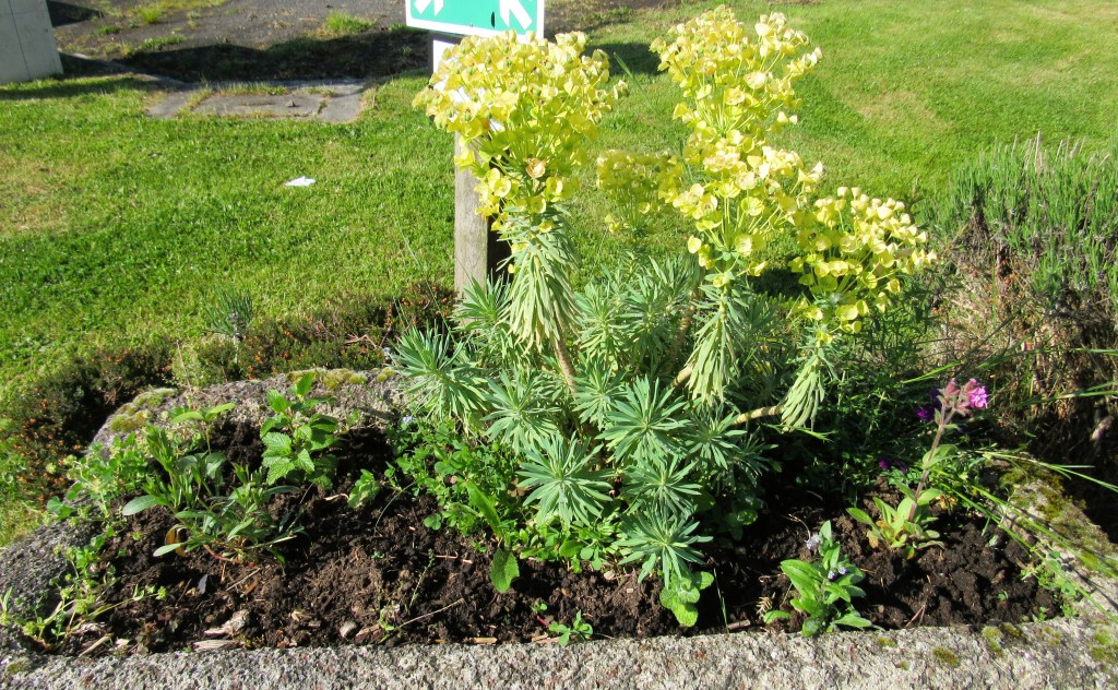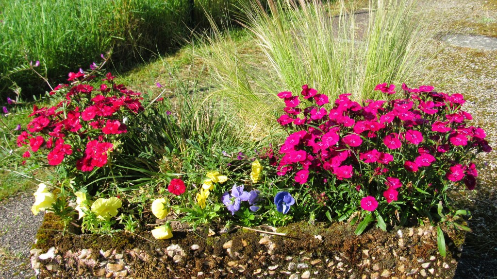 En haut à gauche, bac (auge ancienne installée sur le Champ de foire) fleuri depuis le printemps 2024 spécial « faible entretien, bonne résistance à la sécheresse voire économe en eau » avec son Euphorbe Chariacas, ajouts ce mois-ci en remplacement des pensées de: Gaura de Lindheimer, Mélisse, Bourrache, Silène, il reste une pensée. Nous avons semé quelques graines estivales. En haut, au centre, bac vers la cantine scolaire (rue des peintres) voici, en plus d’une graminée, les deux très beaux pieds d’Œillet de Chine, trois pensées et de la vesce commune (pas de changement). En haut à droite, bac de la cantine numéro 2 : trois œillets de Chine (capables de supporter le plein soleil à la très longue floraison), Sedum Spectabile, Sedum griseum (les plantes qui n’ont jamais soif).