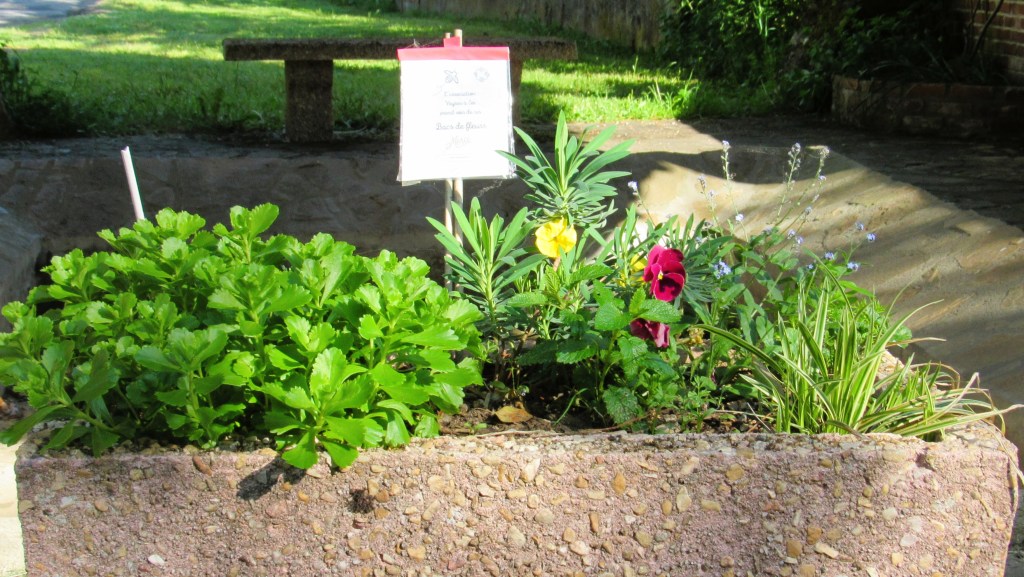 En bas à droite, nouveau fleurissement du bac du lavoir avec du Sedum jaune, Euphorbe, pensées, une graminée, myosotis, sedum rampant. Au centre, l’un des quatre bacs devant l’ancien restaurant (rue des poètes)Gaura bicolore, bourrache, sedum… Dernière image en bas, tombe de l’ancien cimetière : souci orange, œillet des poètes, chrysanthèmes…
