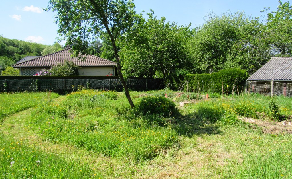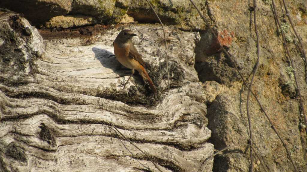 Petite introduction au potager fleuri: On plante, on sème, on tond juste une allée qui permet de circuler autour et on laisse les plantes faire leur vie au son des insectes et avec la bénédiction des oiseaux, en ce moment, le rouge queue noire (ici, une femelle présente dans le jardin au naturel en mai 2023).