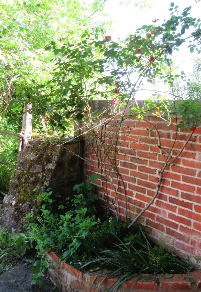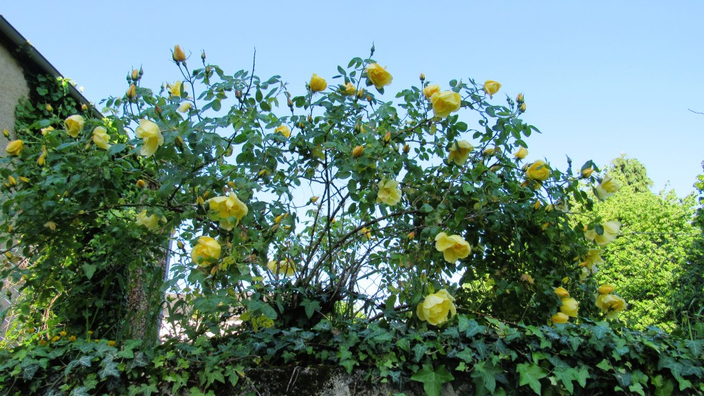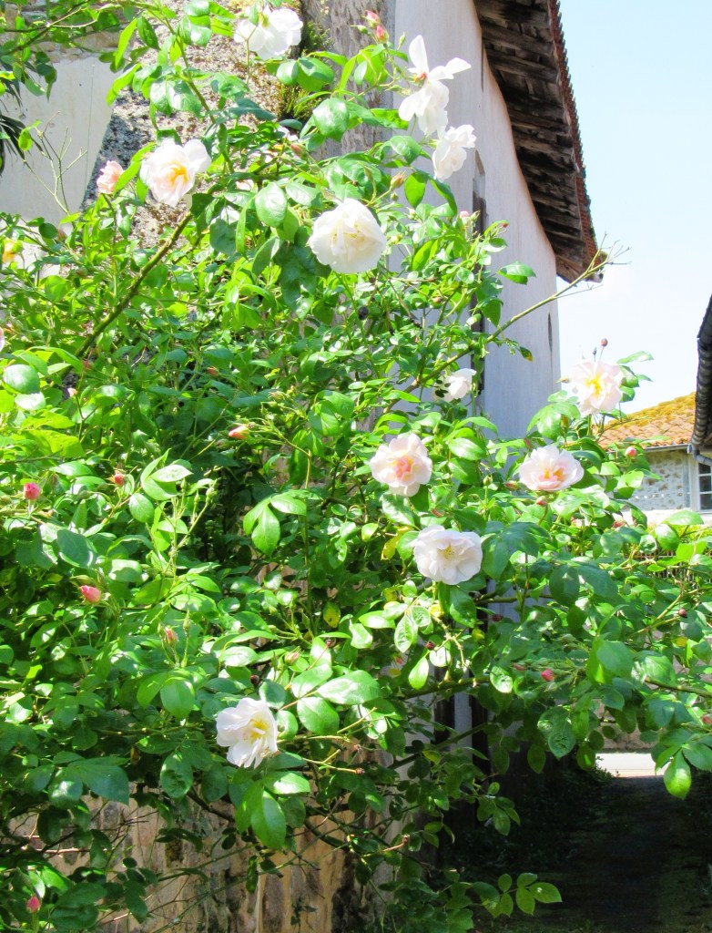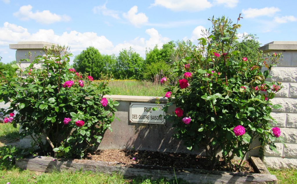 Tout d’abord, les bonnes nouvelles question rosiers. Ci-dessous, en haut, un rosier bien vaillant à la couleur profonde (rue Fée des Neiges) qui aurait bien besoin d’avoir un support, d’attaches contre le mur pour ravir son espace comme il se doit. La rue des Quatre saisons (quartier lavoir) a fière allure avec ses très beaux rosiers, à ce qu’on nous dit, entretenus par une habitante. A droite, la ruelle des Eglantiers, pas empruntée depuis des mois, voici donc ce beau rosier qui trône le long de sa grande grille, un plaisir!
