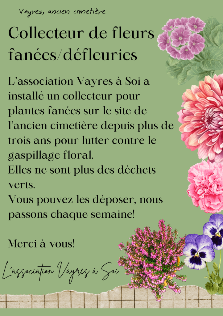 Petit rappel sur la présence du collecteur de plantes fanées/défleuries sur le site de l’ancien cimetière (2022). Ici, en publication.