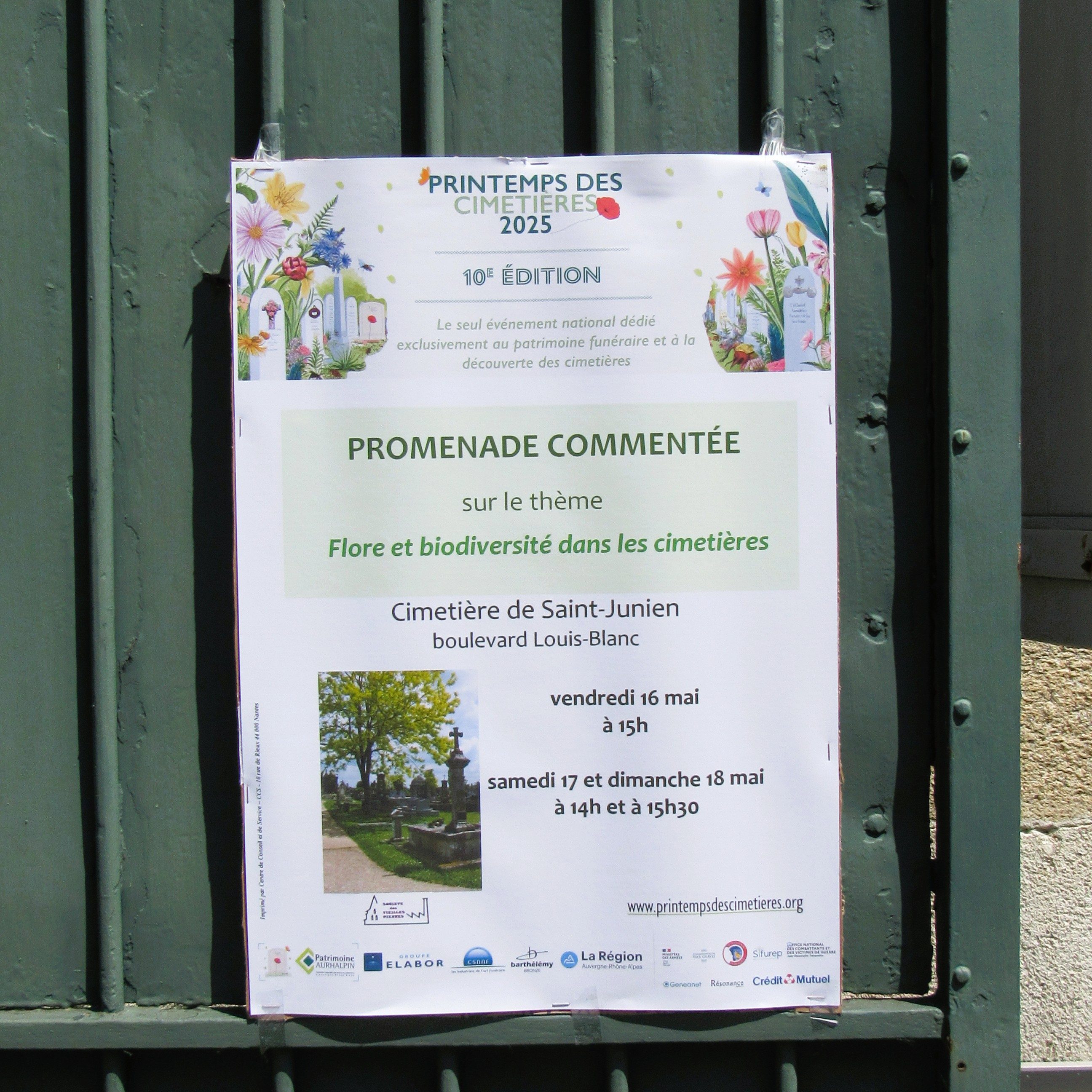 Pour sa dixième édition, nous n’avons, exceptionnellement, pas participé aux Printemps des Cimetières 2025! Nous étions en visite, non loin, puisque nous nous sommes rendues à Saint-Junien.