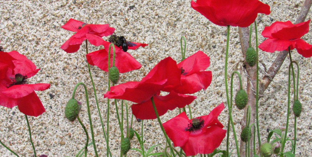 Et de l’Abeille charpentière (Xylocope) nichée dans le gros bouquets de Coquelicots. Cette dernière n’est ni un frelon, ni un bourdon malgré son bourdonnement fort bruyant! Sa taille et sa superbe couleur bleue foncée…C’ est une abeille sauvage!