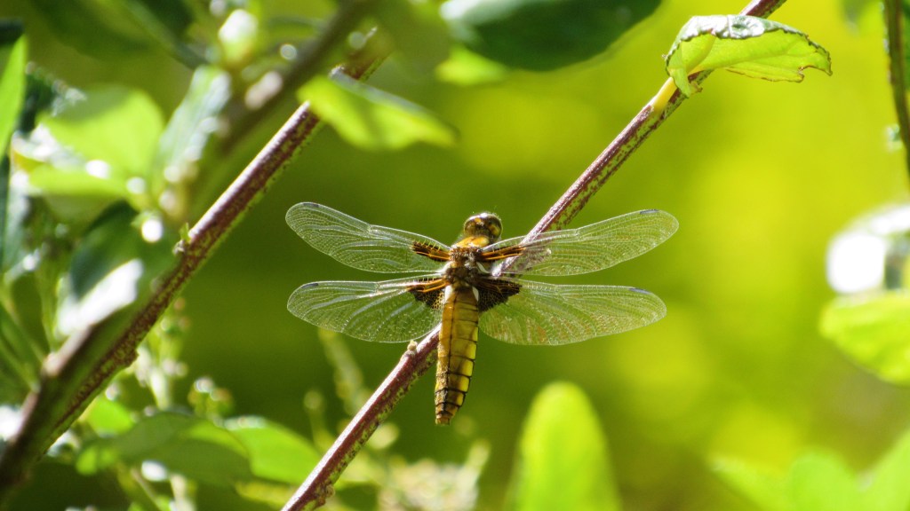 Ci-dessus, côté terrasse, au cœur du Céanothe, la visite de la libellule, ici, toute de jaune vêtue, on pense à une femelle, Libellule Déprimée ( Libellula Depressa (anciennement Ladona Depressa)!
