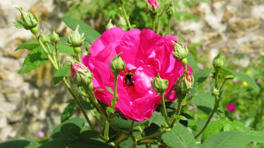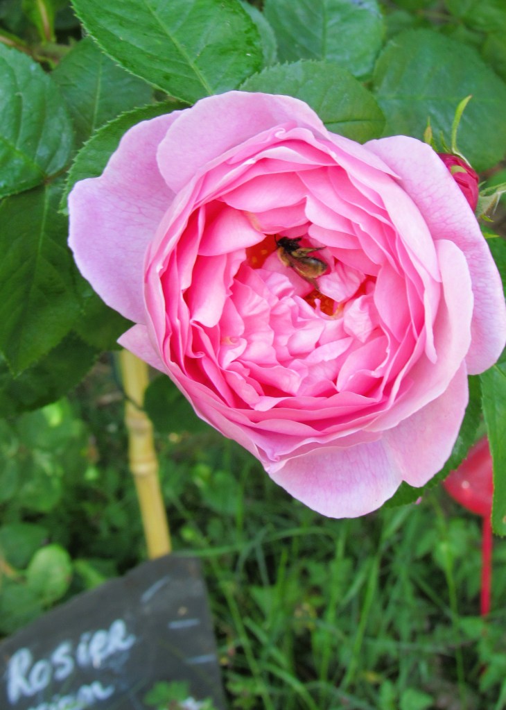 En un à gauche, le rosier ancien Rosa Gallica officinalis (rose des apothicaires, Rose de Provins) tout en fleurs en mai et son bourdon, grand pollinisateur!