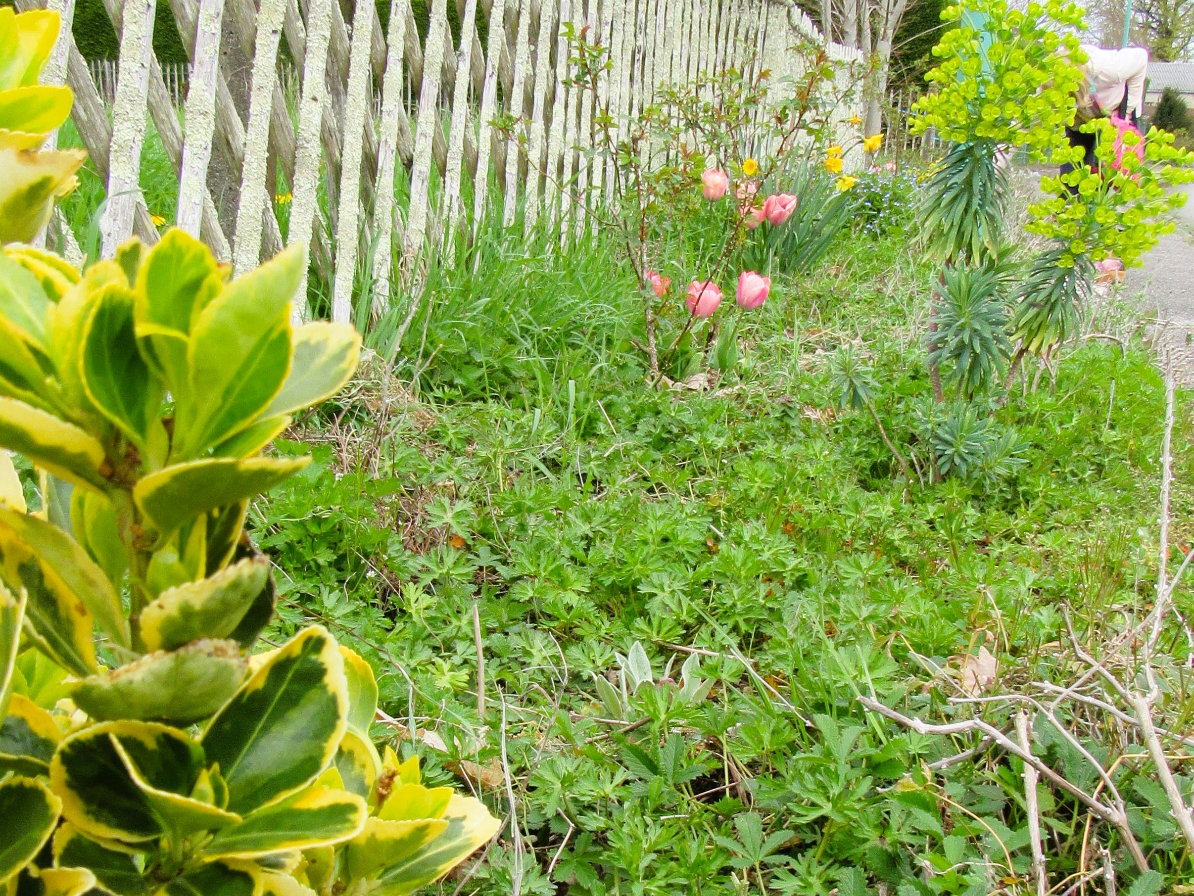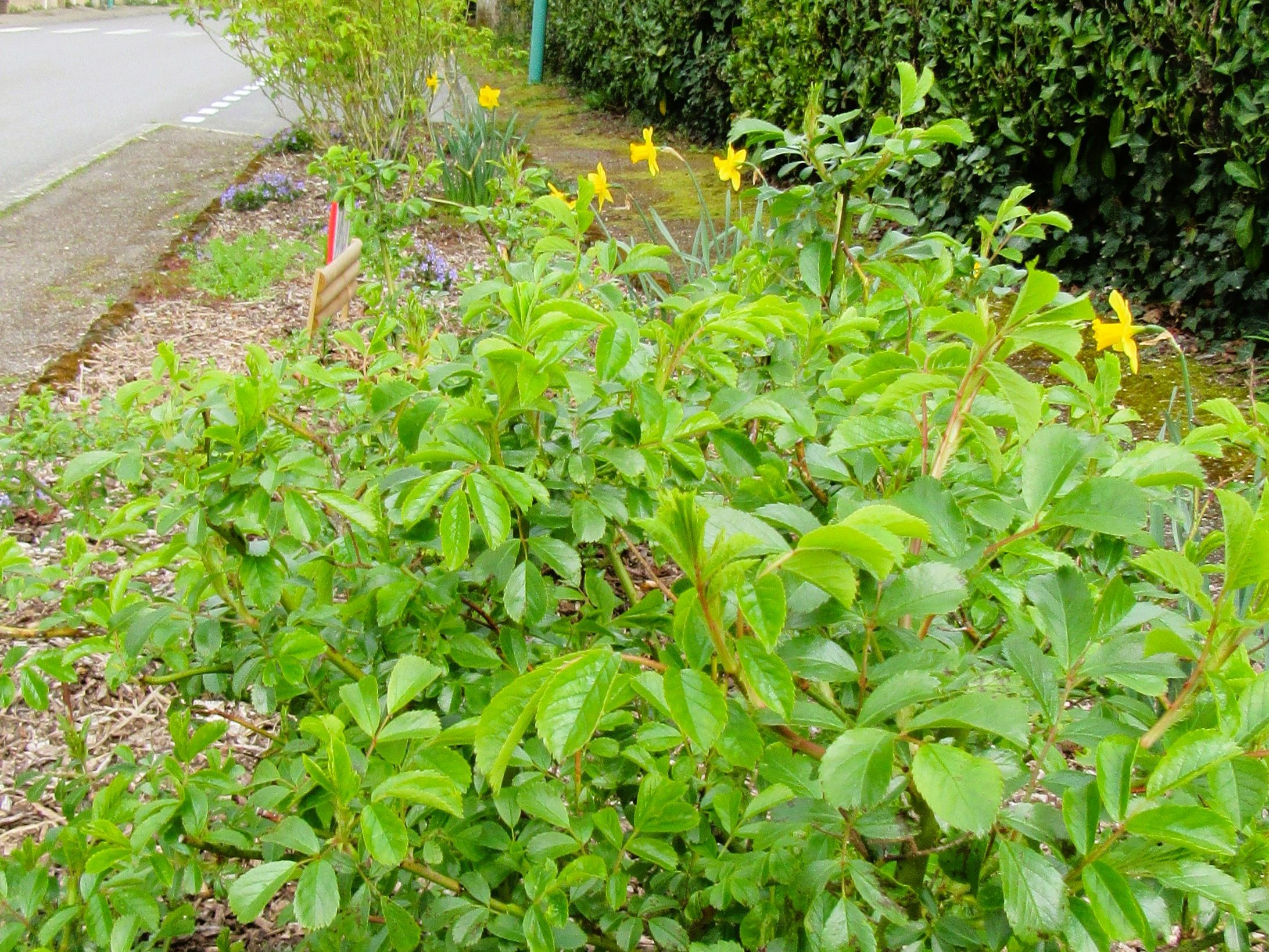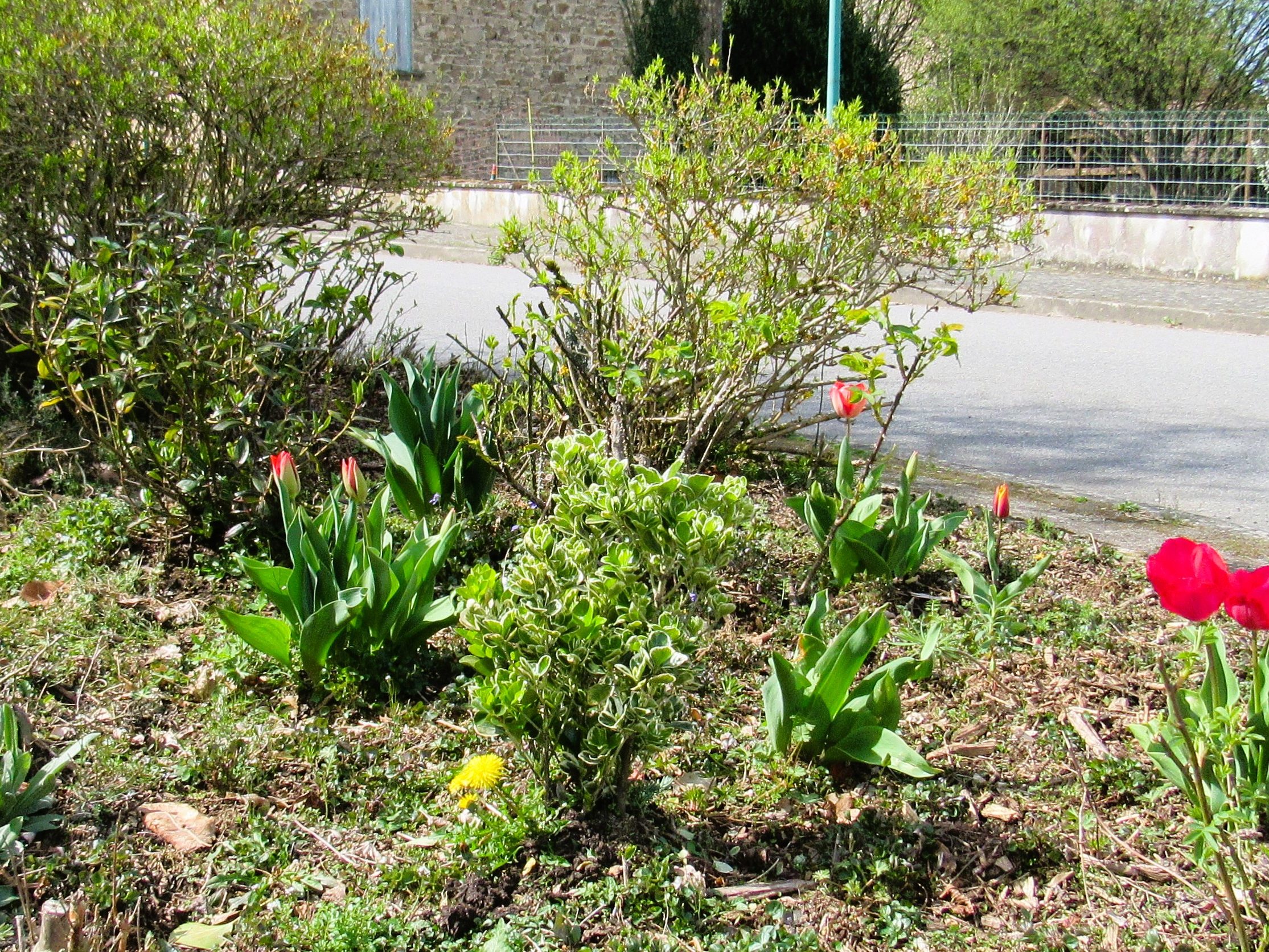 Pour le massif situé rue des poètes, un travail de longue haleine de bientôt trois ans, pour ces presque 20 mètres repris en piteux état. Doté de ses 17 rosiers qui ont eu tant de mal à survivre, nous avons entrepris un entretien mensuel et plus en période plus propice. Des vivaces ont été plantées, des graines, chaque année, sont semées, nous mettons à disposition de quoi manger et se cacher, c’est-à-dire de quoi vivre pour de nombreux insectes et pour un somptueux lézard vert qui a élu domicile au cœur des plantes et herbes un peu folles…