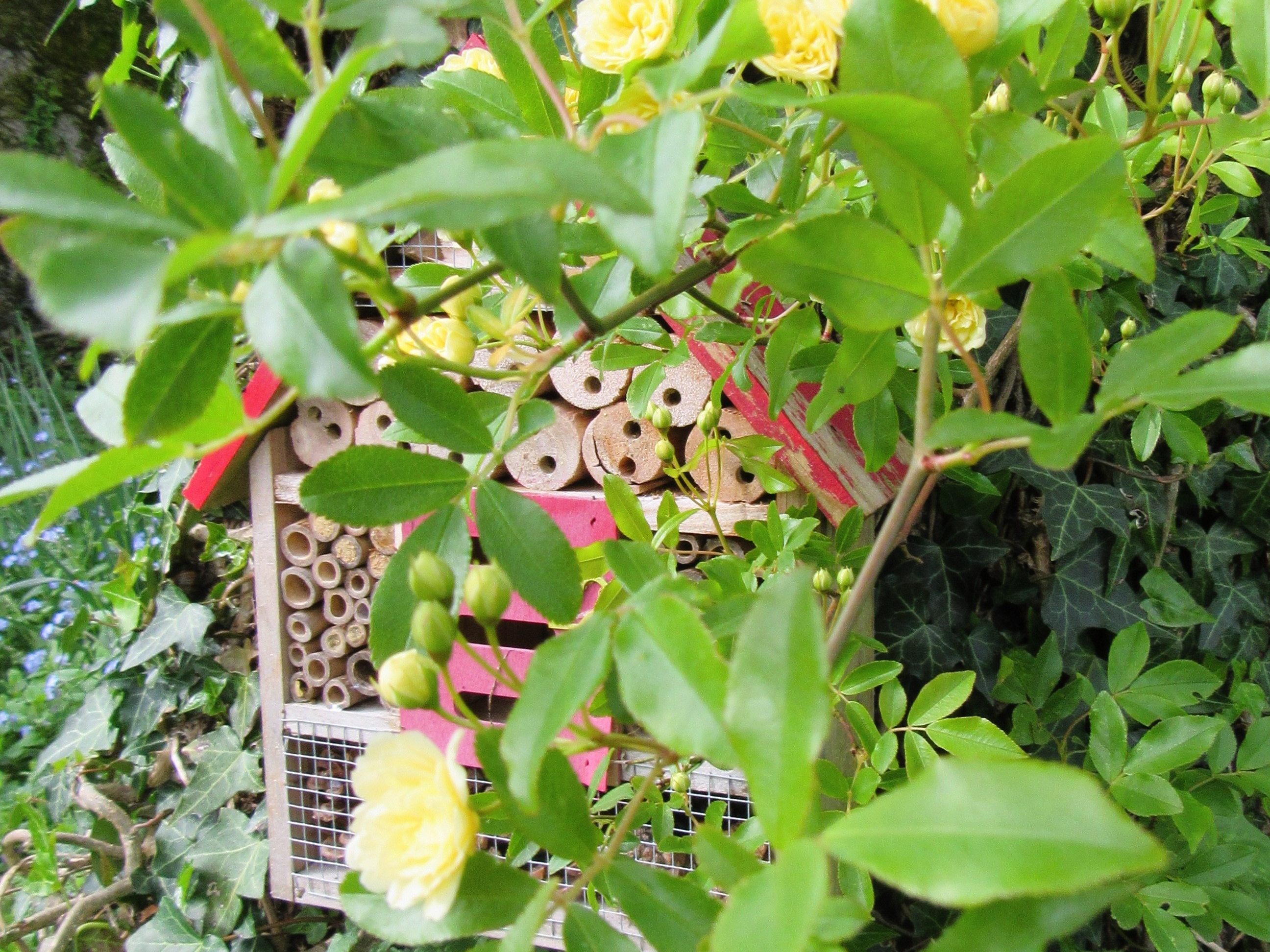 Pour lesquels nous avons construit un jardin adapté, sans chat, en plantant des arbustes à baies, des haies persistantes, mellifères et autres, en installant deux nichoirs (tronc du grand sapin), en attente de deux autres au niveau du grand cerisier, un gîte à insectes et tant d’autres petits refuges, ici et là…
