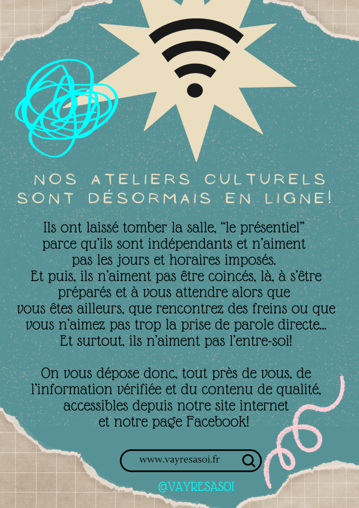 Depuis mars 2024, Les ateliers Singuliers (ateliers culturels et artistiques) sont désormais uniquement en ligne!