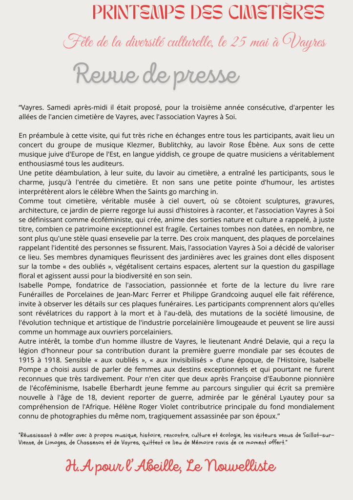 Vayres à Soi mêle biodiversité et patrimoine. Cofondée par Joëlle Petit, jardinière bio experte et Isabelle Pompe, ingénieur culturel, toutes deux résidentes à Vayres, en Haute-Vienne, notre association rassemble nos passions pour l’histoire, la nature et la diversité culturelle!
