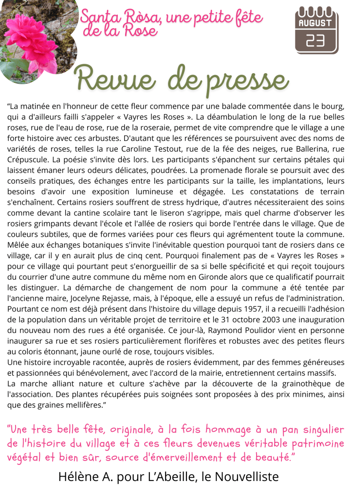 2. Santa Ròsa, une petite fête de la Rose, 23 août 2024, Vayres, lien : Allons Vayres si la rose